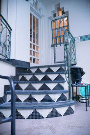 Approaching the front door, one climbs a zig-zag double staircase, emphasizing the already imposing and geometrically-intricate structure. Two window panes decorated with sharp shapes flank the door on its sides and framed in the middle is a fish sculpture, all hinting at what is to unfold inside. Walking through a small coat area, an aquatic dream is presented in the next room, framed by the doorway. A stepped-tray ceiling of bold blue sets the stage for a central chandelier. In the words of singer Lana Del Rey, the chandelier reflects “like Art Deco out on the floor — shining like gun metal, cold and unsure.”